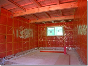 2010.06.06 防湿工事: 外壁面 ゲラスウール100mm充填 防湿フイルム0.2mm内貼り