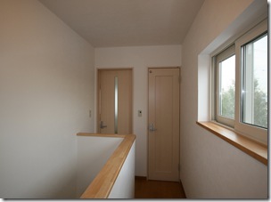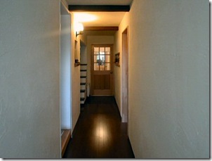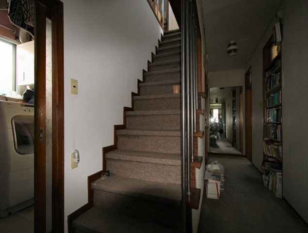 階段と廊下を仕切っていたホールを撤去し、すっきり。じゅうたん敷きをフロアーに壁は漆喰塗り、階段は既存を活かしモダンに。