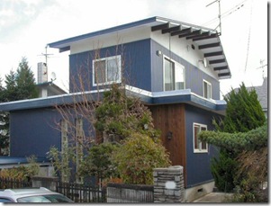 紺色のガルバリウムと白壁のコントラスト、アクセントにレッドシーダー(カナダ杉)を貼り、和モダンに生まれ変わった外観。