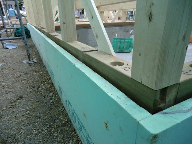 【左】 2011.06.03 断熱:土台との隙間にウレタンを吹付けて断熱欠損を防ぐ。