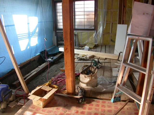 【右】 2008/11/8 居間増築部分:柱を抜いた部分の梁補強。