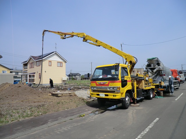 【左】 2013.06.01 コンクリート打設:ポンプ車から圧送された生コンクリートを型枠内に流し込みます。