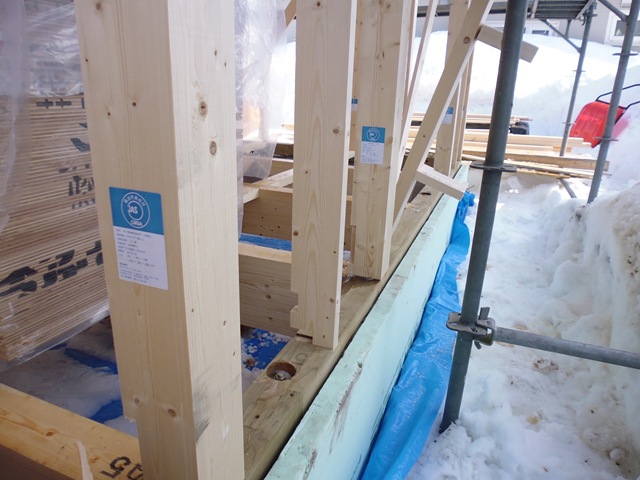 【右】 2014.02.25 2階床面:下地合板(ネダレス合板)が雪で濡れないように養生する