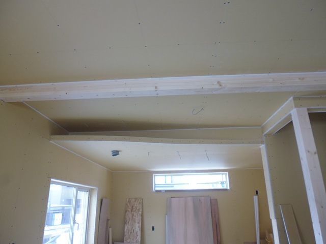 【左】 2014.03.26 リビング~ダイニング・キッチン方向:ボード貼りも終了、対面キッチン腰壁造作中