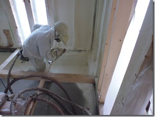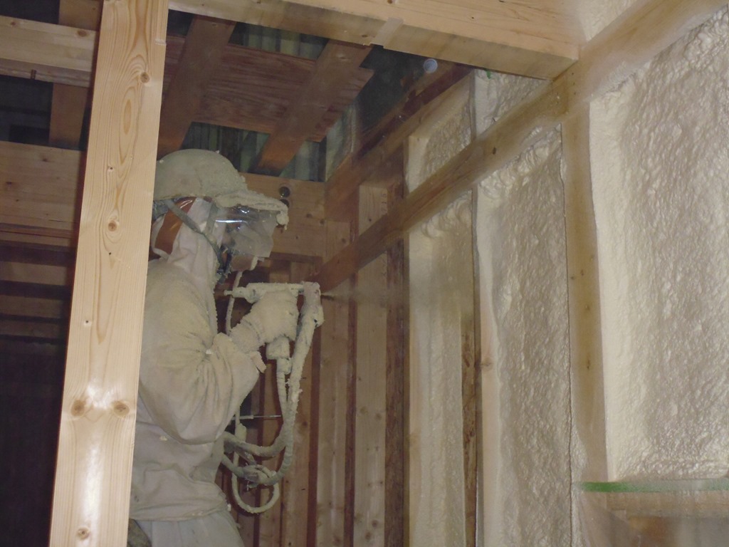 【左】 2014.11.03 1階外壁:吹付けの様子 「木造住宅における外断熱方法」特許工法