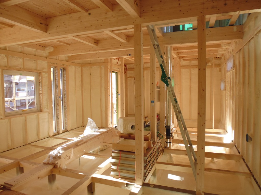 2014.11.03 2階小屋組= 断熱材「エアクララ」:現場発泡樹脂スプレー方式(特許工法)で気密と断熱を同時に実現