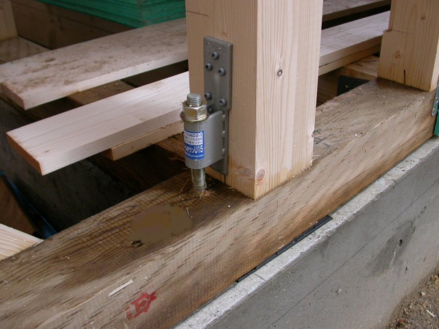 ホールダウン金物:柱脚と同等に柱頭にも使用して上階の柱又は横架材と緊結する。