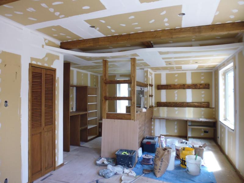 2016.06.13 1階リビング:木部の塗装(オスモ)終了、塗り壁(ハミルトン)の下地処理開始。