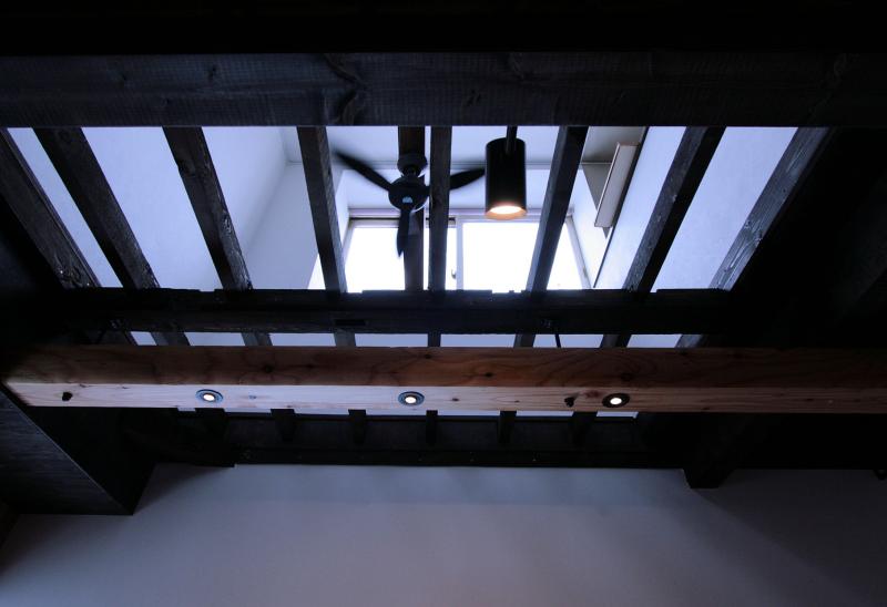 リビング吹抜:半割丸太にダウンライト埋め込み