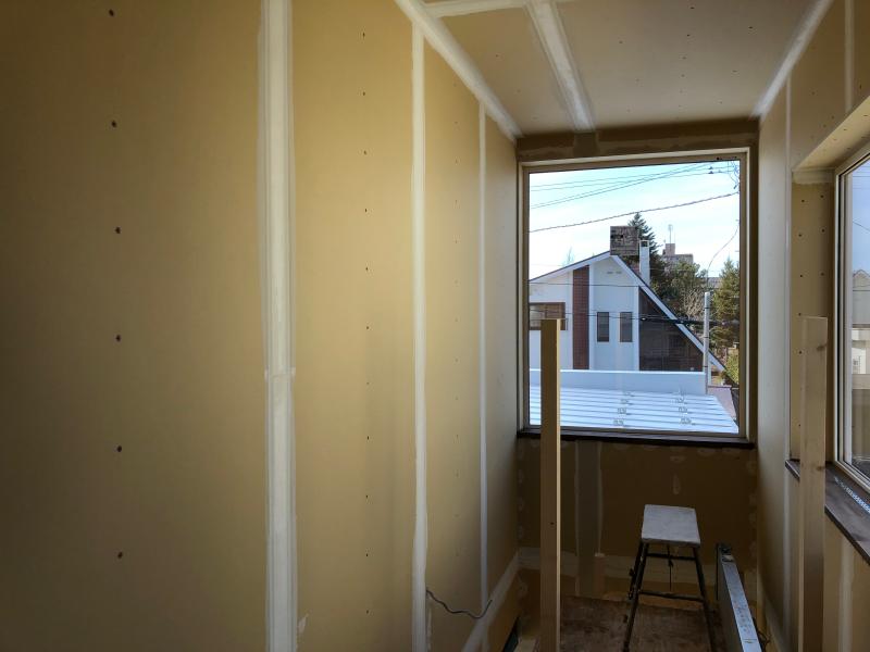 2021.04.06 リビング:木部塗装も完了、塗り壁の下地処理が始まりました。