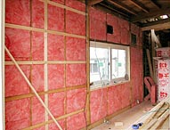 1階床には150mmのグラスウールと結露防止のための0.1mmのポリフィルムを貼り、壁には100mmのグラスウールを充填しました。