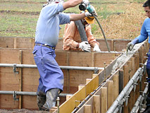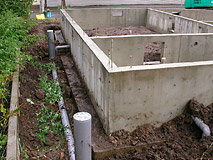 - 【左】基礎貫通部分詰めモルタル処理【右】基礎完了。埋め戻し、天端均しも終了しました。