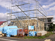 - 全景:2階の軸組もほぼでき上がり、屋根の形も見えてきました。