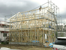 - 小屋組:ツーバイ材で屋根の骨組をします。大工さんもガンバッテますね。