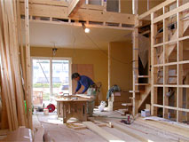 - 【左】棟梁(トウリョウ)さんも頑張ってますヨ!【右】吹抜けを見上げる。