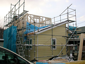 天候の具合を見ながら、既存屋根の解体と2階床組の作業を同時に進行していきます。