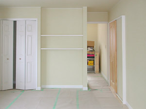 内装工事 2階の壁紙下地処理。 2階。 【左】 1階:キッチン壁タイル貼り完了。 / 【右】 1階:トイレ床タイル貼り完了。 【左】 1階:台所床タイル貼り作業。 / 【右】 1階:クロス貼り下地処理。