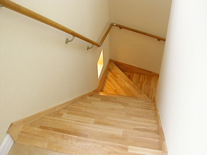 【左】 階段: 天然木とアイアンの手すり子。 / 【右】 階段: ニッチがフットライトの役目も果たす。
