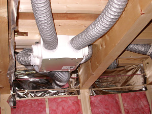 【左】 気密 : 先貼りシートと壁面のポリフィルムを重ね貼りをする。 / 【右】 換気 : 第三種換気システムの排気機器